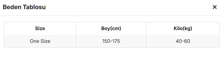 Ürünlerimizin beden aralıkları tam bedendir ve doğru bedeni seçmek için beden tablosuna bakabilir veya bizimle iletişime geçebilirsiniz.